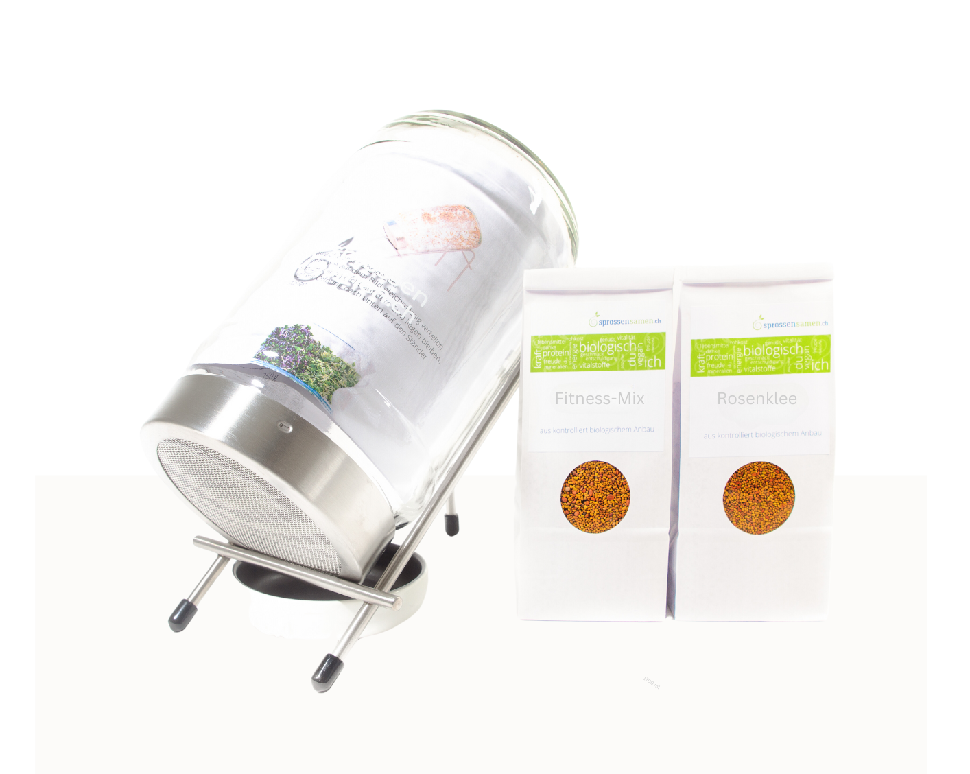 • 1 Keimglas (1700 ml) – Ideal für die einfache Sprossenzucht zu Hause. Zieh schnell und mühelos frische Sprossen. (Inkl. Ständer und Unterteller)