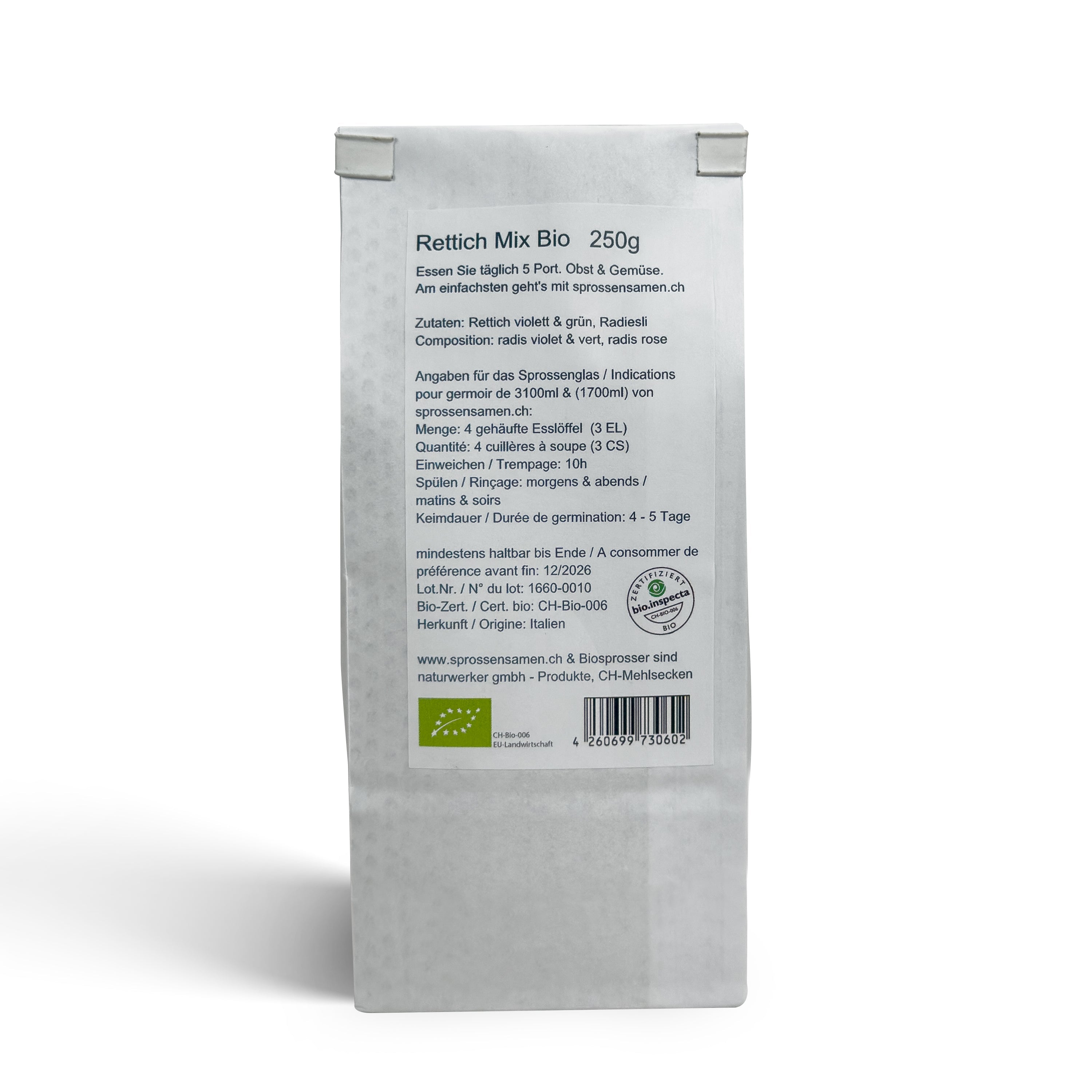 • Keimdauer: als Sprossen 4-5 / als Microgreens 6-12 Tage. Anschließend bis zu 2 Wochen als frische Sprossen haltbar.