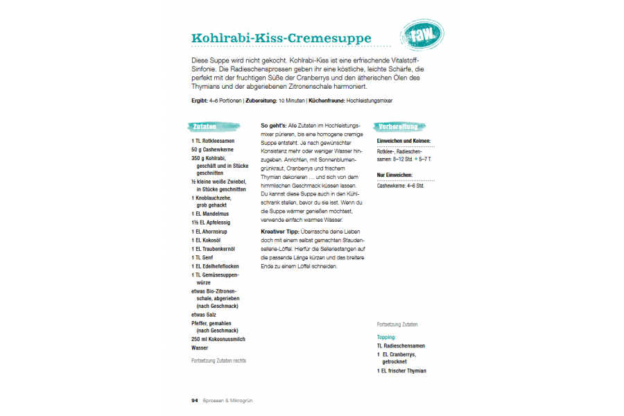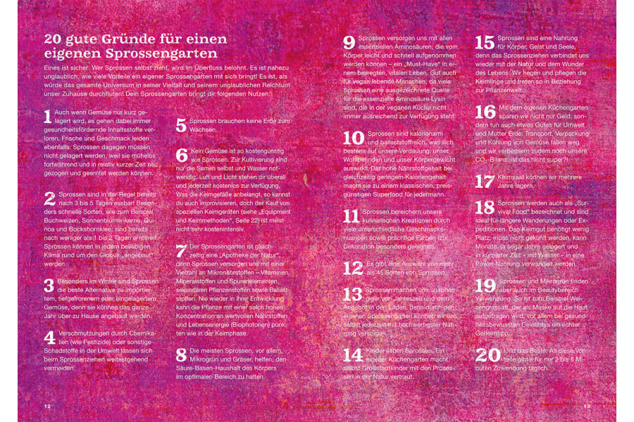- Kreative und rein pflanzliche Rezepte, die zeigen, zu welchen kulinarischen Höchstleistungen Sprossen in der Lage sind.